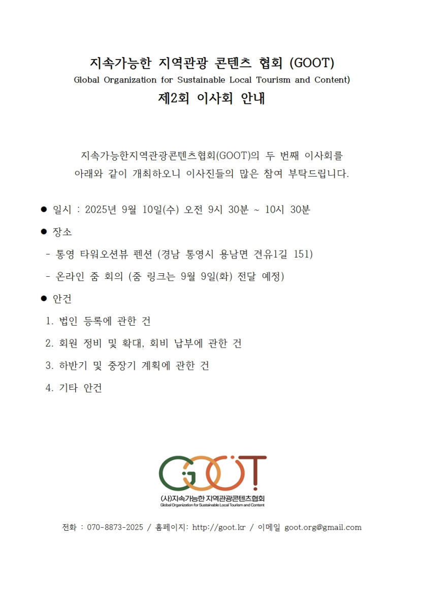 지속가능한지역관광콘텐츠협회(GOOT)의 두 번째 이사회를